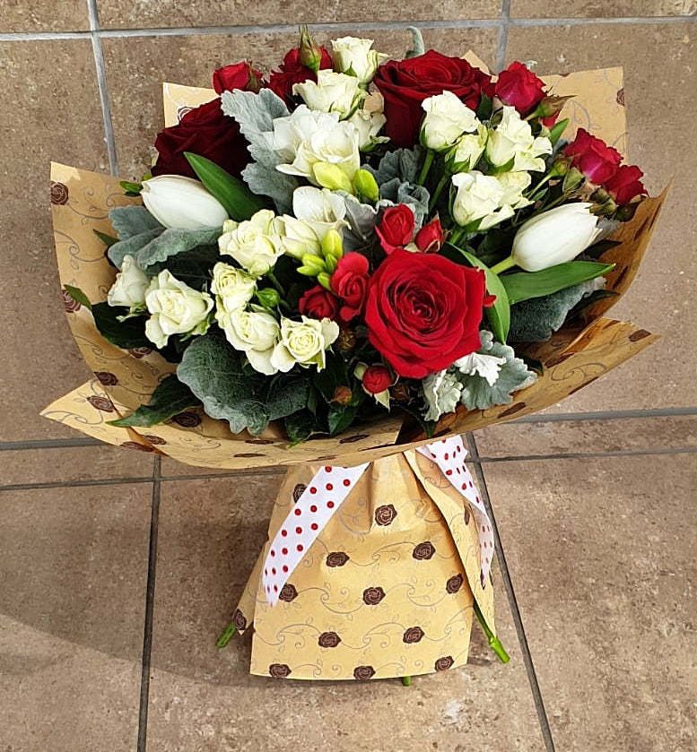 Acest buchet conține 3 Trandafiri roșii, 3 Miniroze rosii, 4 Miniroze albe, 3 Lalele albe, 2 Frezii albe, verdeață decorativă și ambalaj.