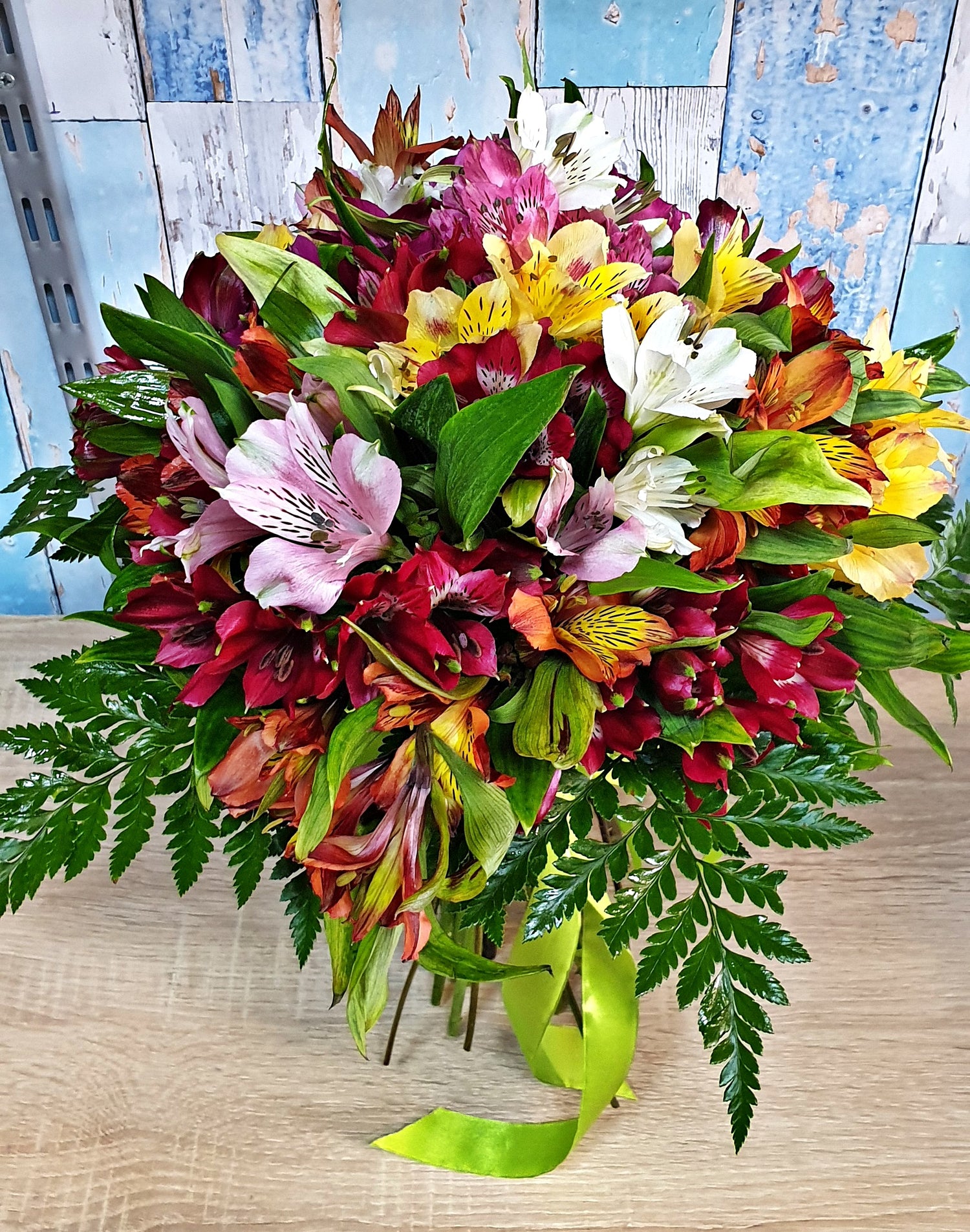 Acest buchet conține 15 Fire de Alstroemeria multicoloră, verdeață decorativă și panglică din satin.