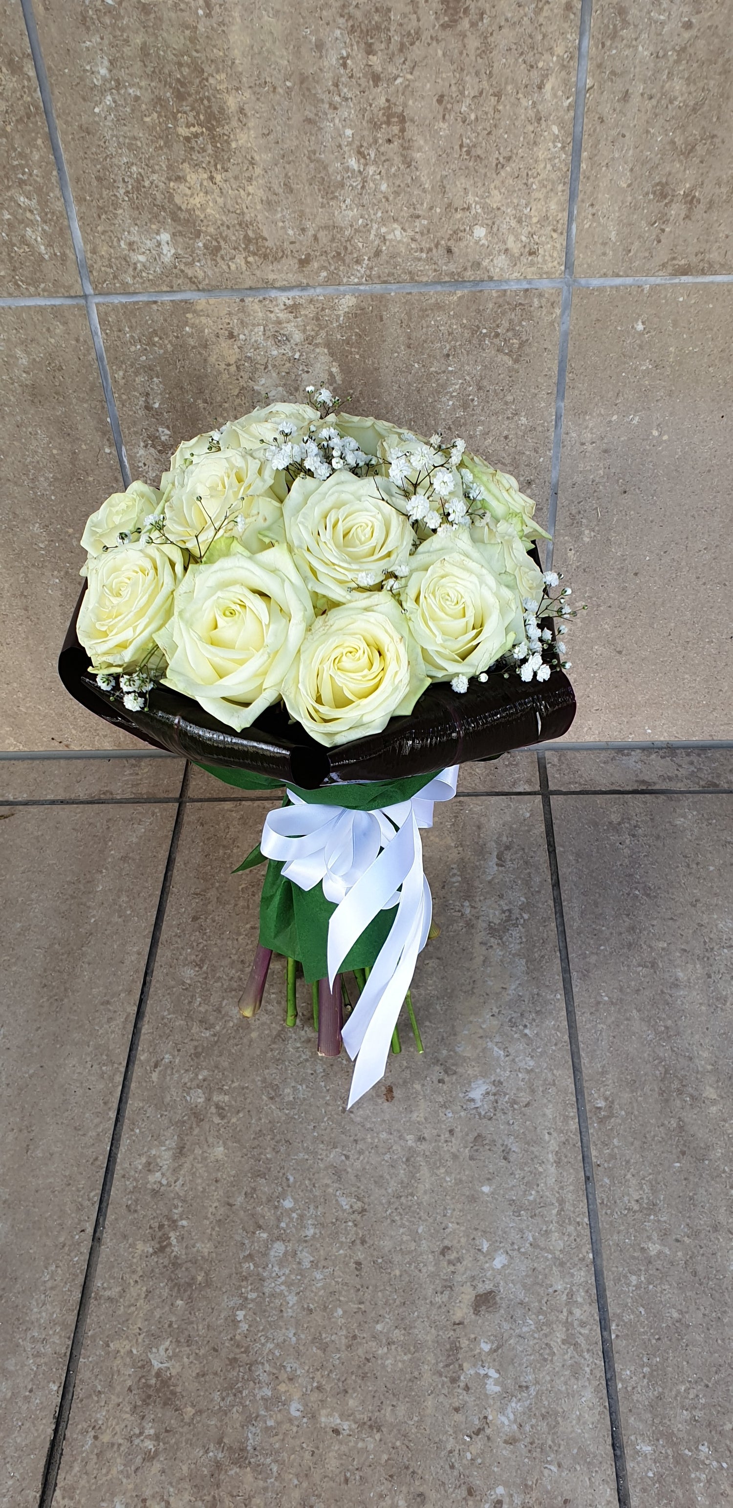 Acest buchet contine 15 Trandafiri albi, Gypsophila, verdeață decorativă și panglică din satin.