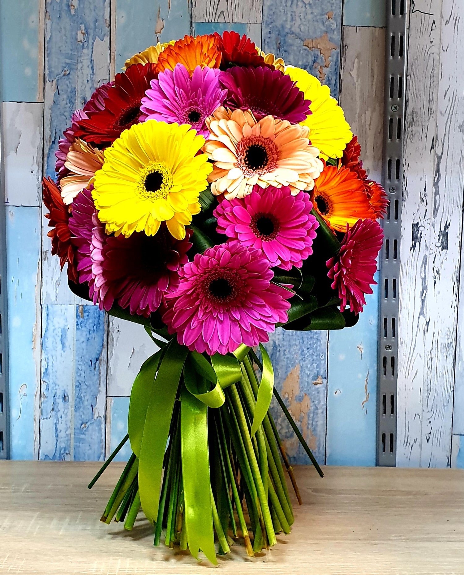 Acest buchet conține 45 de fire de Gerbera multicoloră, verdeață decorativă și panglică din satin.