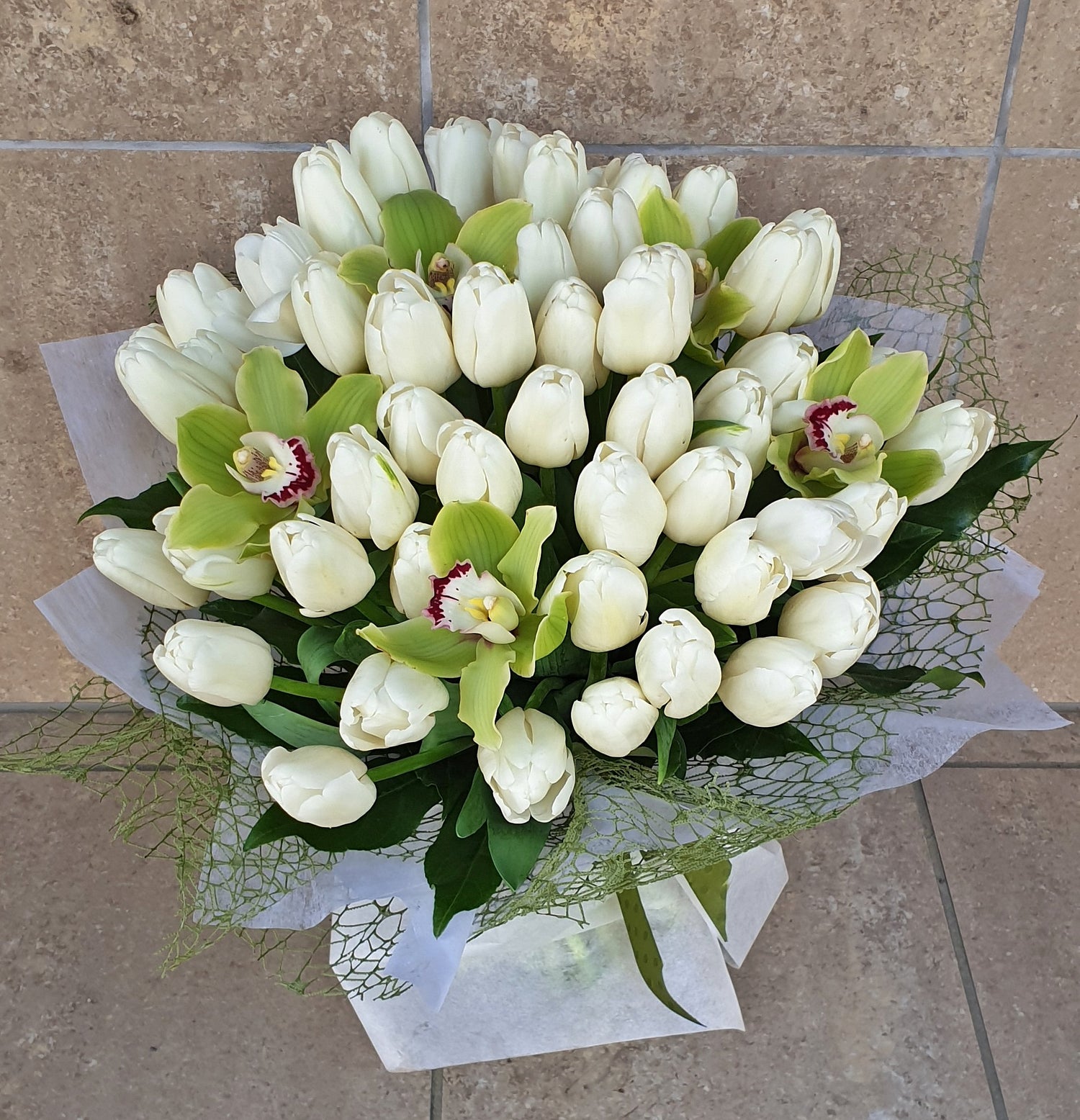 Acest buchet conține 50 de Lalele albe, 5 Orhidee verzi, verdeață decorativă și ambalaj.