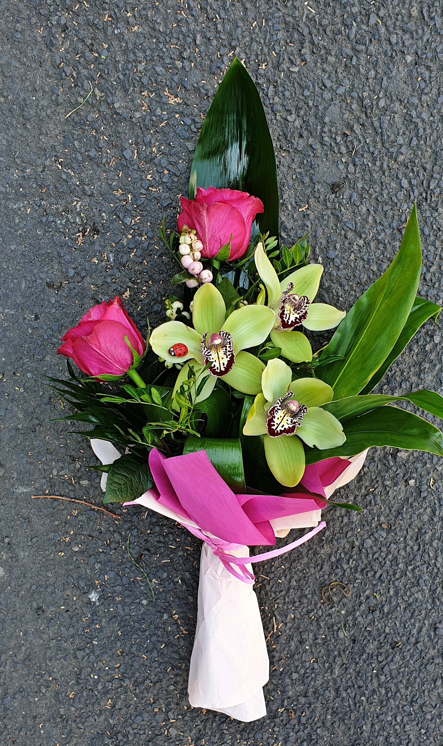 Acest buchet conține 2 Trandafiri roz, 3 Orhidee verzi, verdeață decorativă și ambalaj.