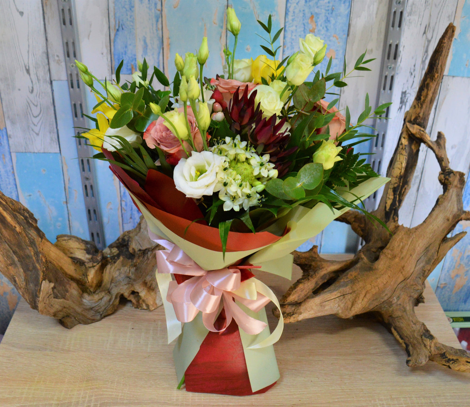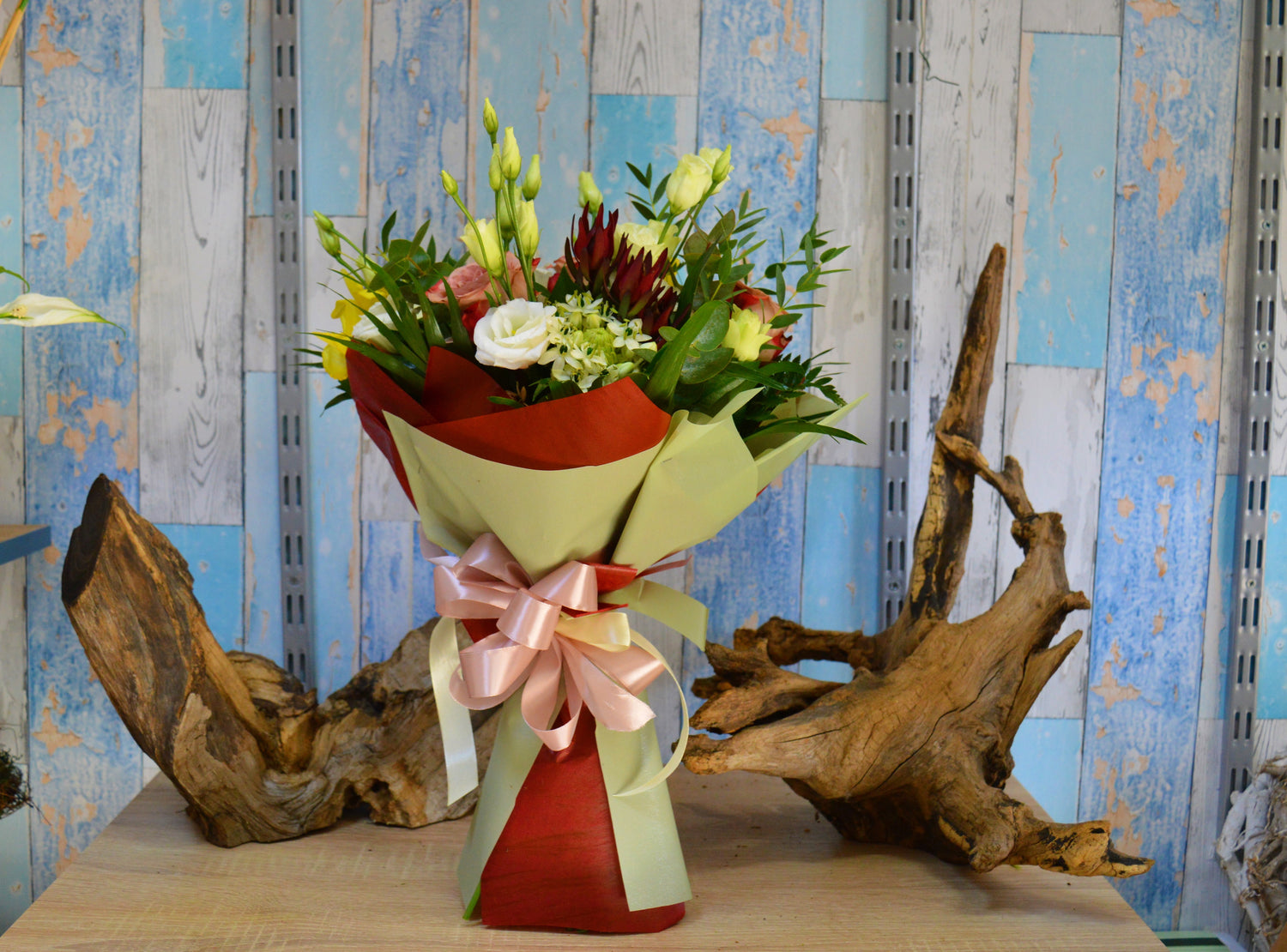 - Acest buchet conține 3 Lisianthus alb, 3 Trandafiri roz, 3 Frezii galbene, verdeață decorativă și ambalaj.