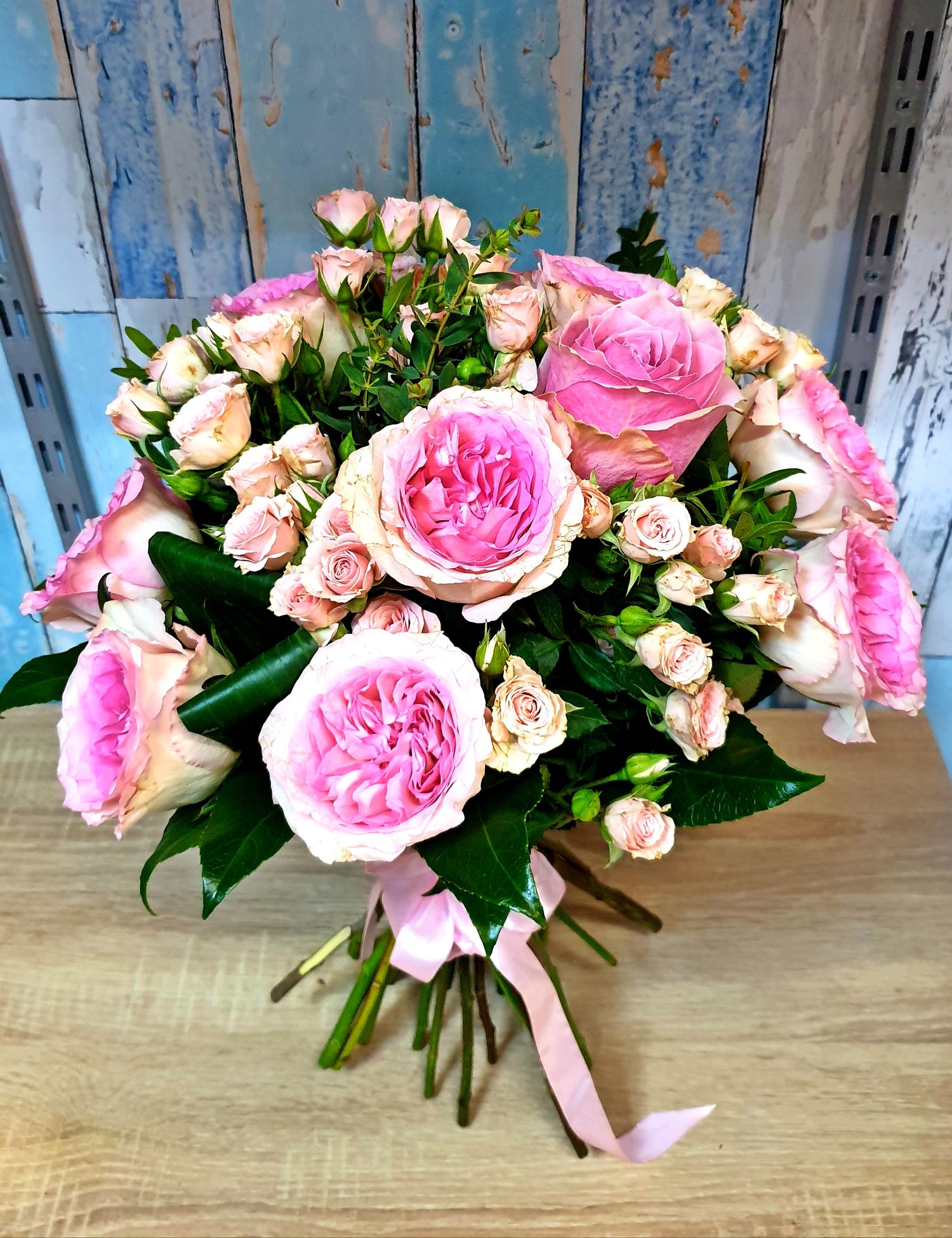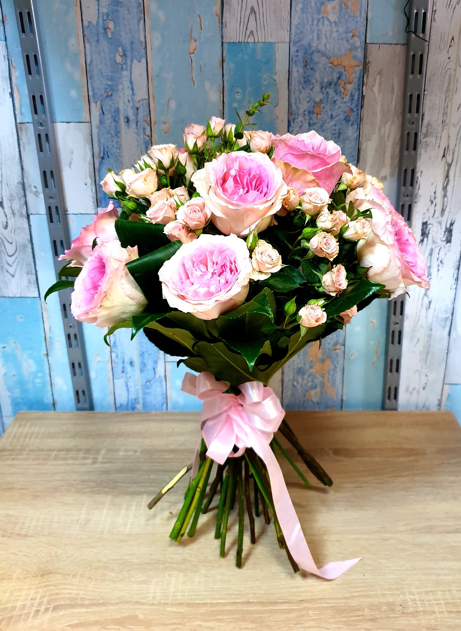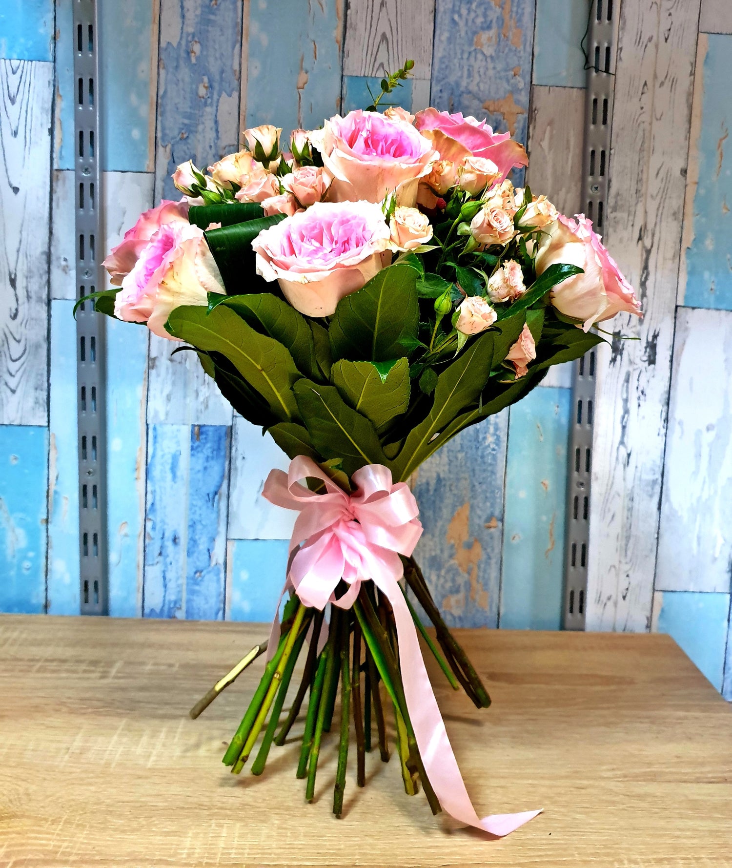 Acest buchet conține 9 Trandafiri roz, 8 Miniroze roz, verdeață decorativă și panglică din satin.