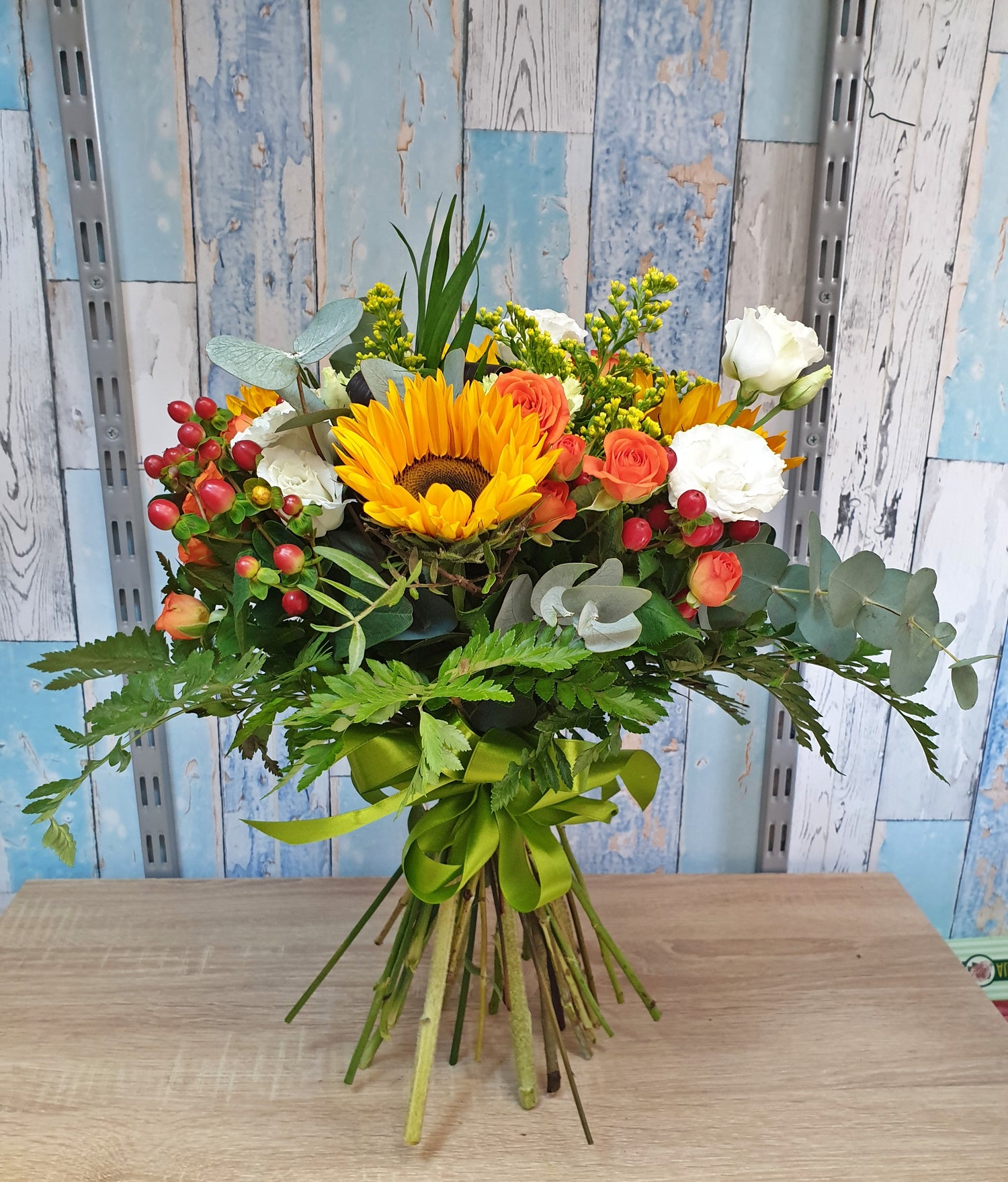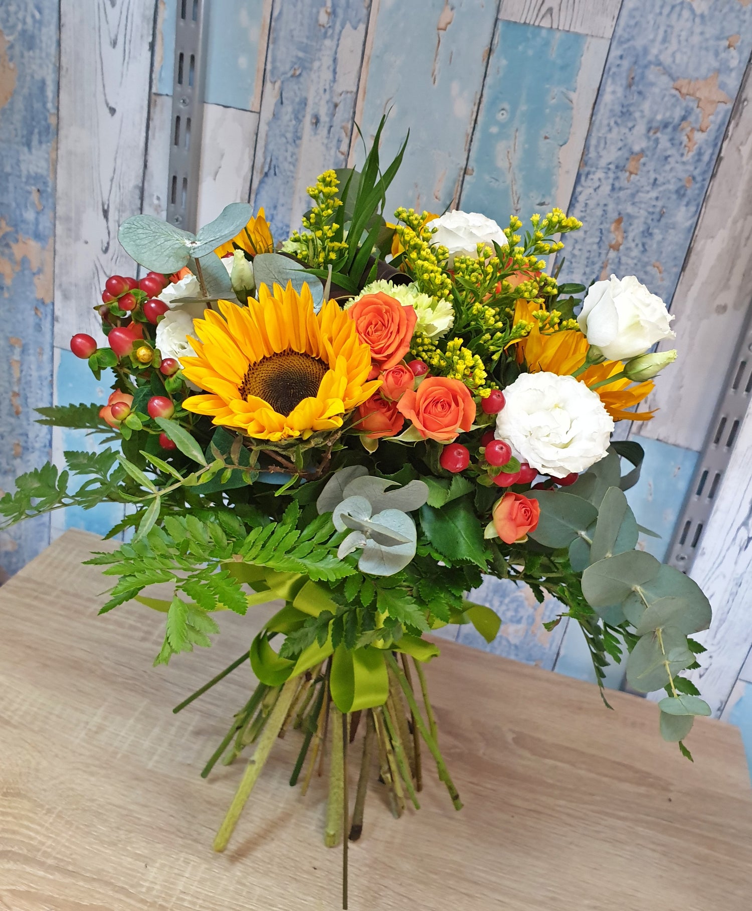 Acest buchet conține 4 Floarea soarelui, 2 Garoafe verzi, 3 Miniroze portocalii, 3 Lisianthus alb, 5 Hypericum roșu, Solidago, verdeață decorativă si panglică din satin.
