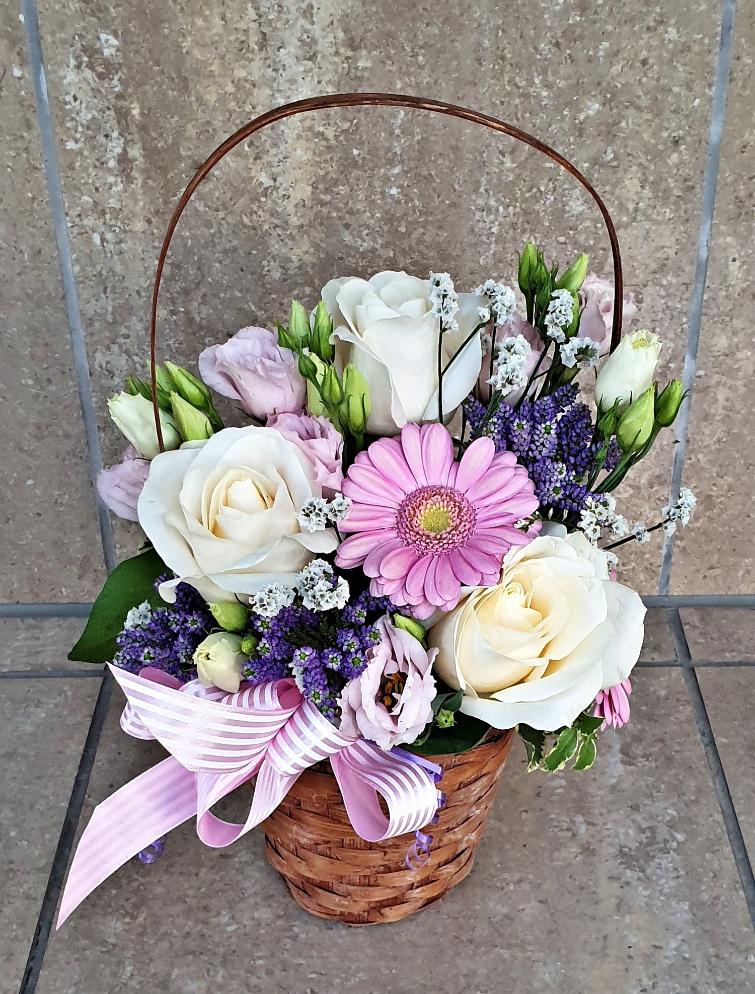 Acest aranjament conține 3 Trandafiri albi, 1 Gerbera roz, 3 Lisianthus roz, Veronica, verdeață decorativă, burete Oasis și coș de răchită.