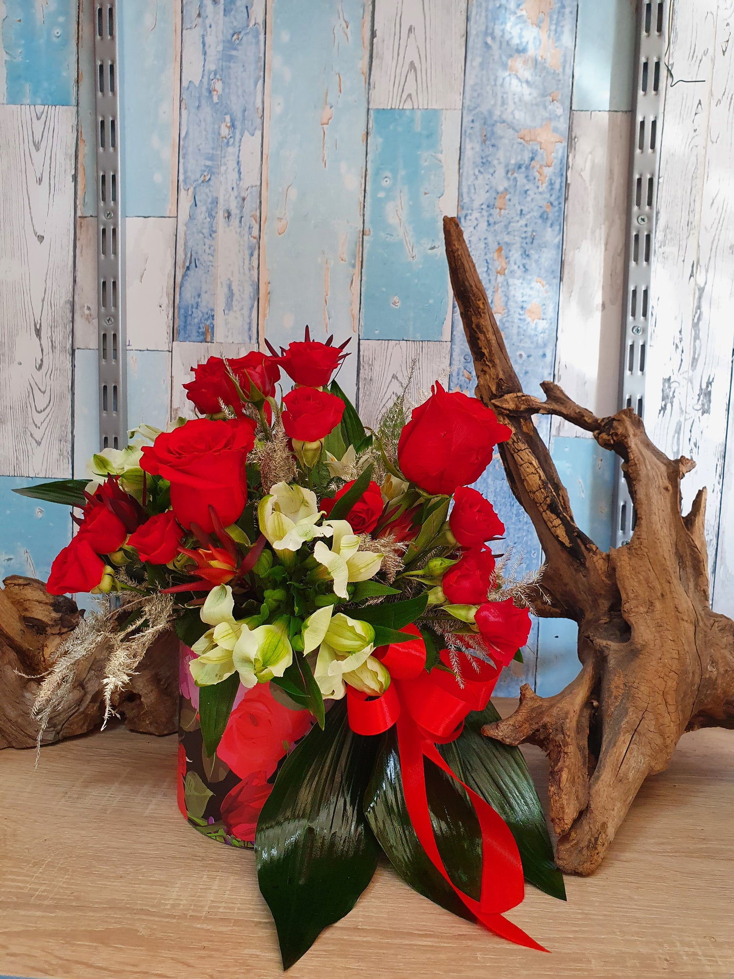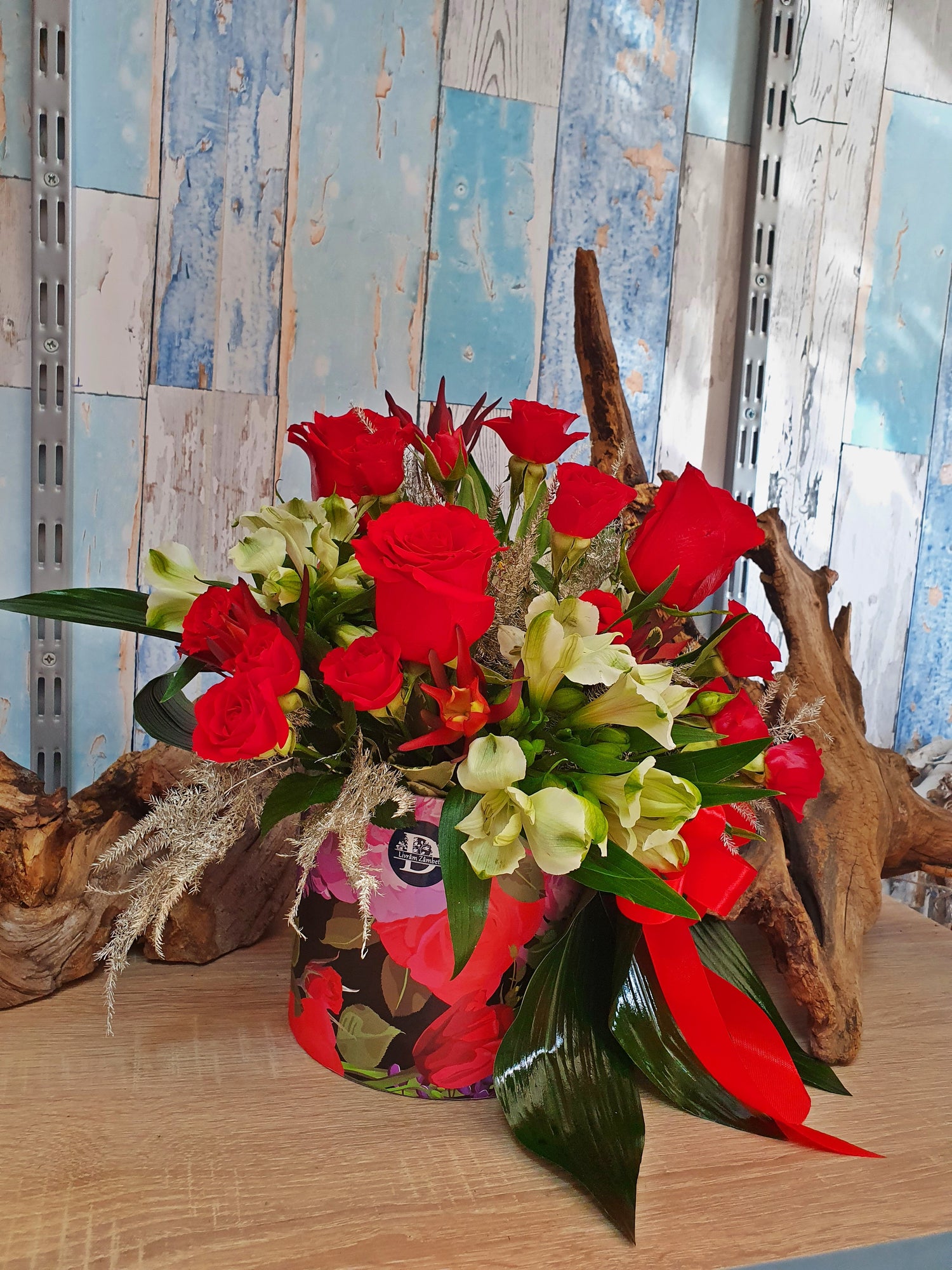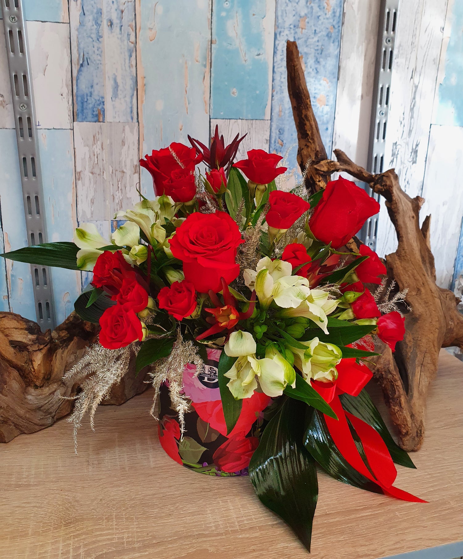 Acest aranjament conține 3 Trandafiri roșii, 4 Miniroze roșii, 2 Alstroemeria albe, Leucadendron, verdeață decorativă, burete Oasis și cutie.