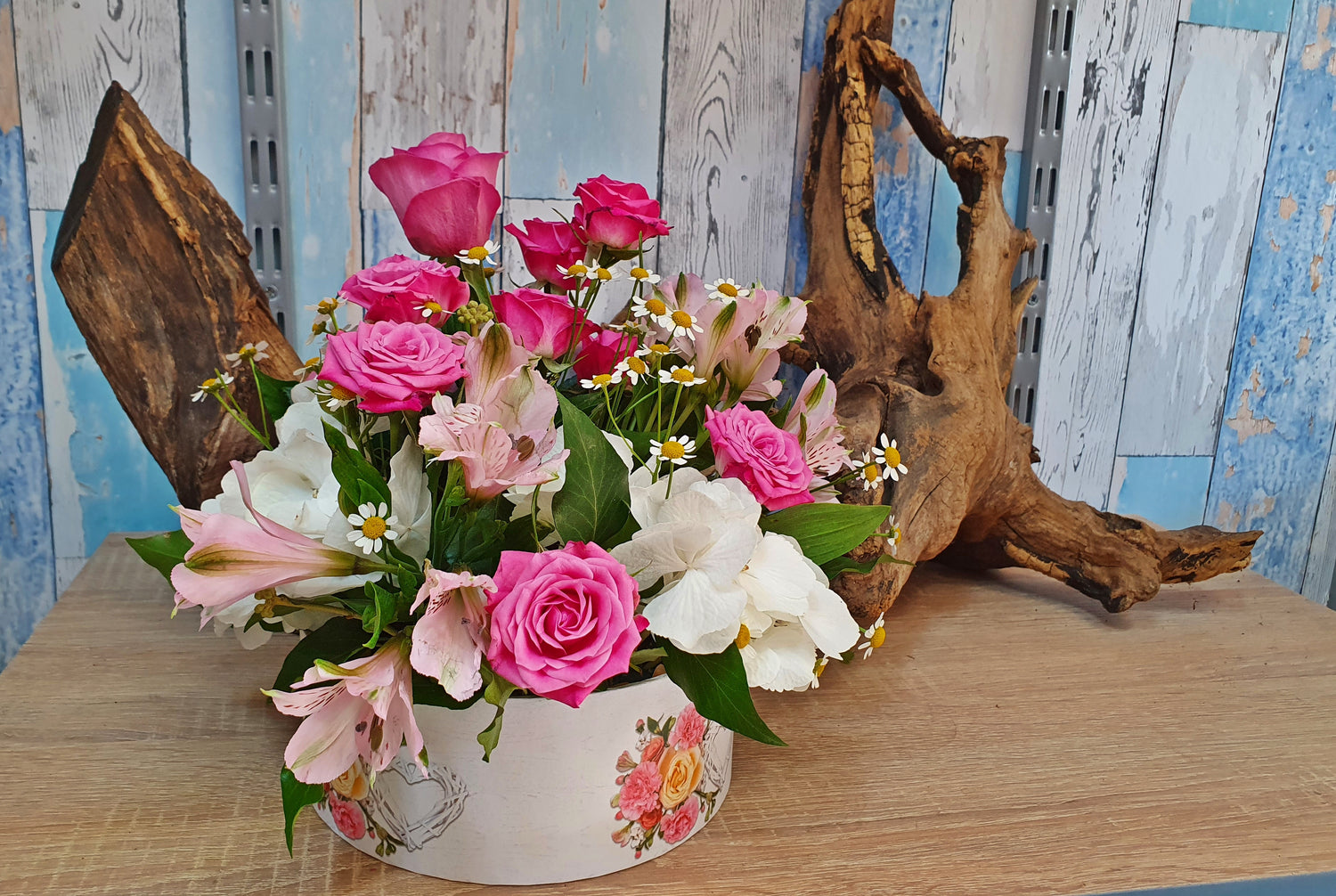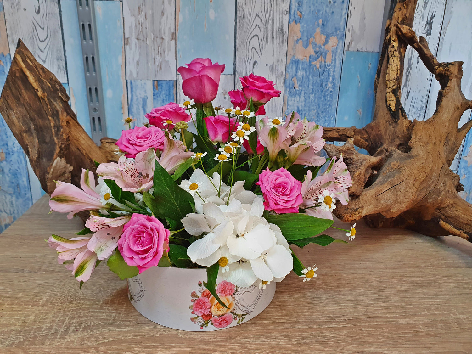 Acest aranjament conține 3 Miniroze roz, 2 Alstroemeria roz, 2 Hortensii albe, verdeață decorativă, burete Oasis și cutie rotundă.