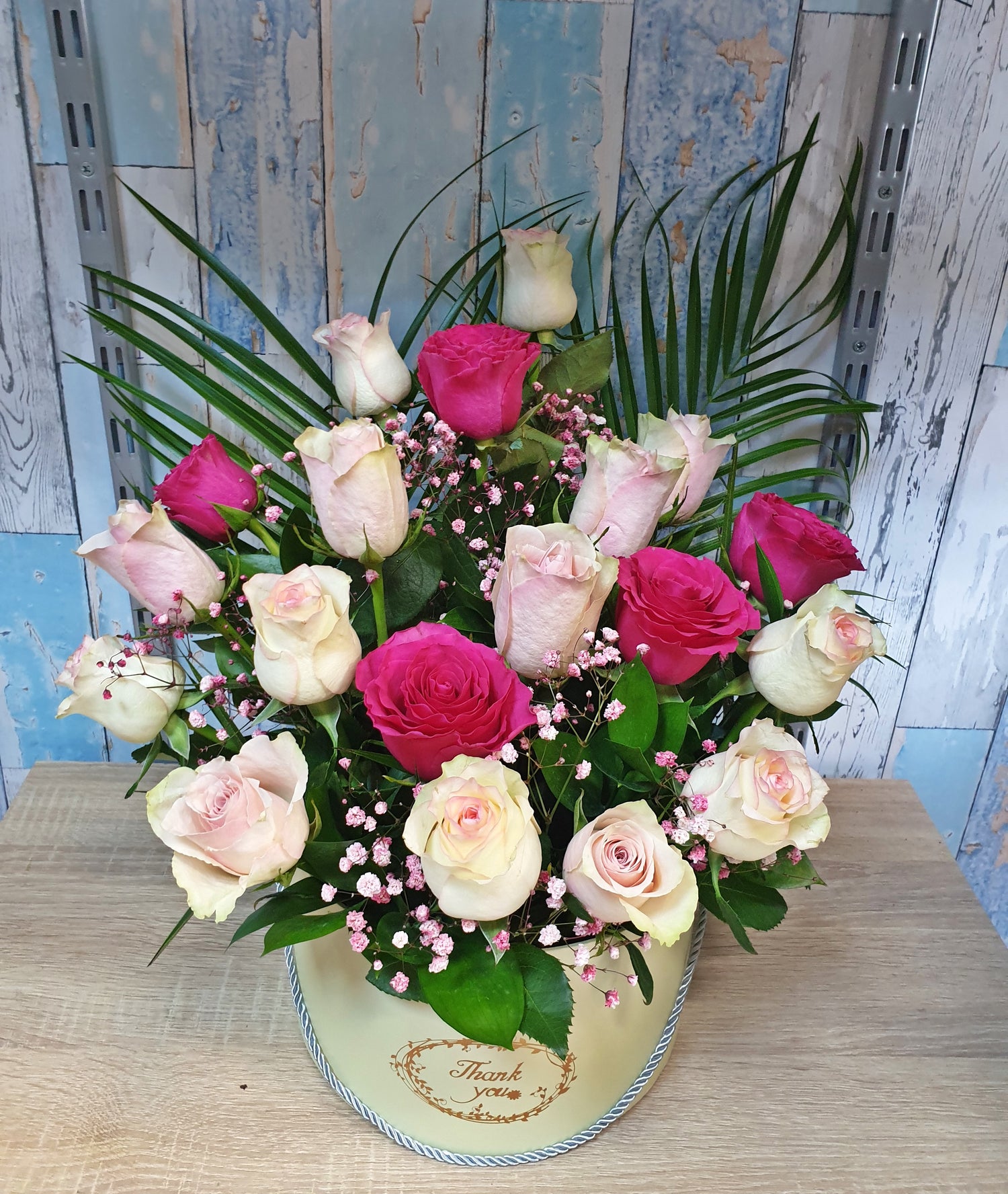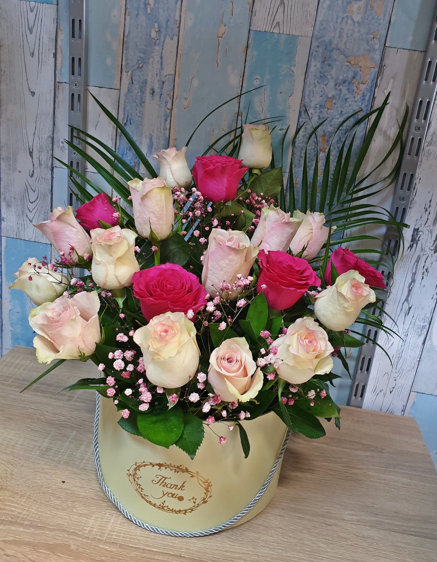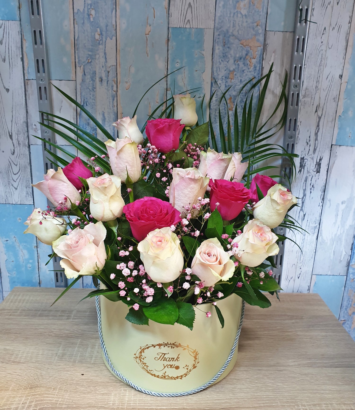 Acest aranjament conține 19 trandafiri roz, Gypsophila, verdeață decorativă, burete Oasis și cutie rotundă.