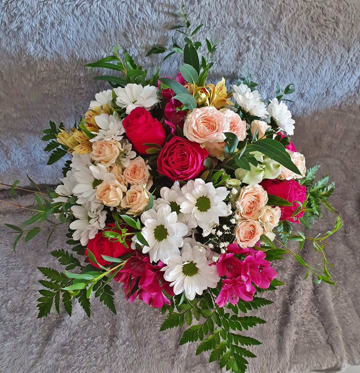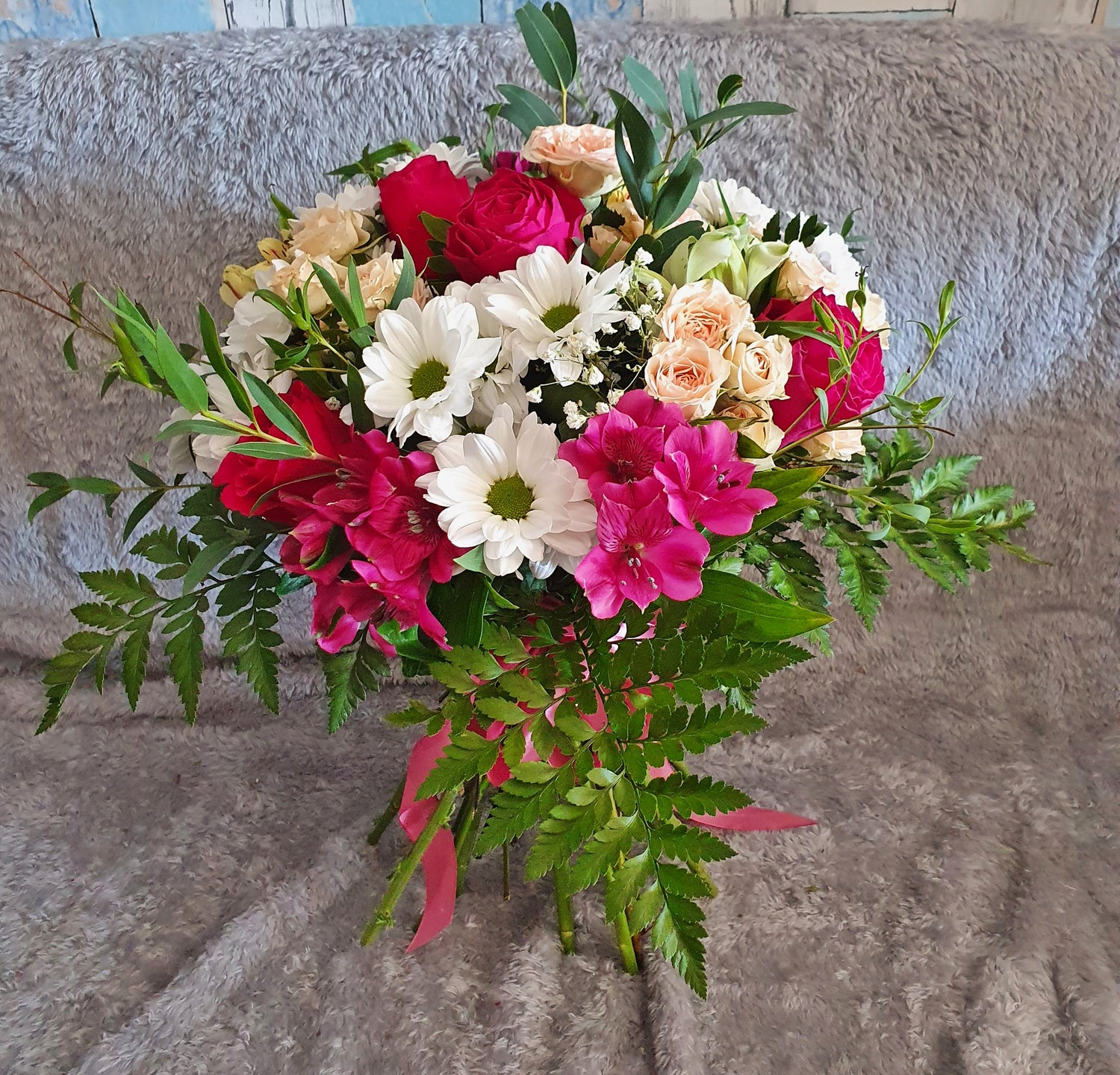 Acest buchet conține 4 Crizanteme albe, 5 Trandafiri cyclam, 3 Miniroze roz, 5 Alstroemeria, Gypsophila, verdeață decorativă și panglică din satin.