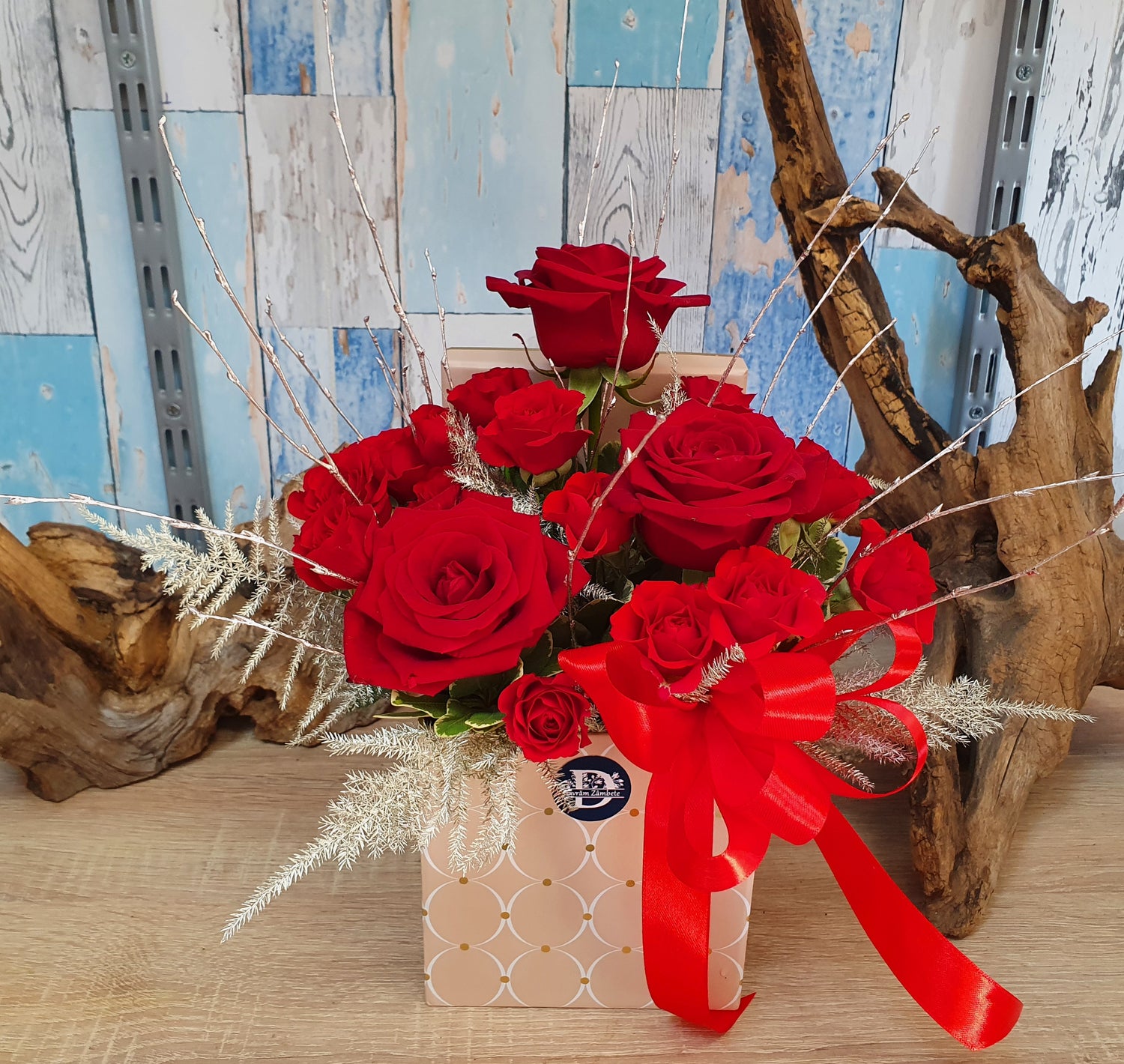 Acest aranjament conține 3 Trandafiri roșii, 4 Miniroze roșii, verdeață decorativă, burete Oasis și cutie.